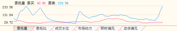 委托比是委托额的另外一种表现形式,委托比设计为一根曲线,不同区间数值代表着不同的市场现状和走势。