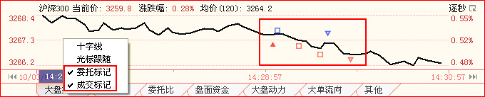 在软件中还有很多从用户角度出发的周到、体贴的人性化细节设计,例如 “十字线”、“光标跟随”、“委托标记”和“成交标记”等,帮助用户更好、更快、更便捷的进行操作。 “光标跟随”,则图上会出现鼠标指针定位时点的相关指标信息,比如在大盘指数界面,光标跟随显示的数据是沪深300指数的点位和涨跌幅信息。
